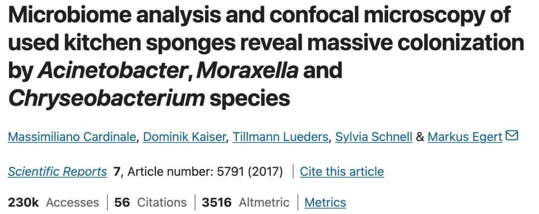 2017年,《自然》杂志发表的一项研究表明,一块长期使用的洗碗海绵中,每立方厘米的细菌数量高达540亿个,整块海绵可能含有多达362种细菌。