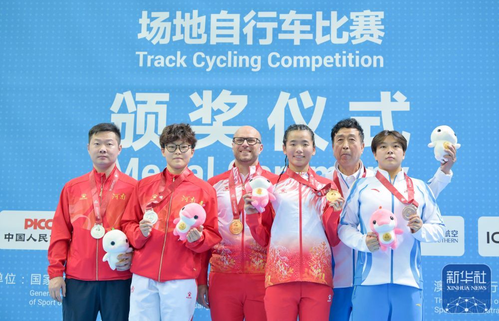 11月15日,第十五届全运会750米场地自行车计时赛决赛在香港举行。 ↑ 吉林队冠军袁丽英(右三)、亚军河南队罗淑艳(左二)、季军浙江队姜雨露(右一)与教练员在颁奖典礼上合影。 ↑ 颁奖典礼上,浙江队教练帮助铜牌得主姜雨露固定奖牌丝带。 ↑ 吉林队选手袁丽英在比赛中。最终,他获得了冠军。 ↑ 吉林队选手袁丽英在比赛中。最终,他获得了冠军。 ↑ 吉林队选手袁丽英在比赛中。最终,他获得了冠军。 ↑ 河南队球员罗淑艳在比赛中。最终,他获得了第二名。 ↑ 河南队球员罗淑艳在比赛中。最终,他获得了第二名。 ↑ 河南队球员罗淑艳在比赛中。最终他获得了第二名地方。 ^ 浙江队球员姜雨露在比赛中。最终,他获得了第三名。 ^ 浙江队球员姜雨露在比赛中。最终,他获得了第三名。 ^ 浙江队球员姜雨露在比赛中。最终,他获得了第三名。 ↑ 河南队球员郭玉芳在比赛中。最终,他获得了第四名。 ↑ 辽宁队球员王丽娟在比赛中。最终,他获得了第五名。新华社记者 胡呼呼 摄