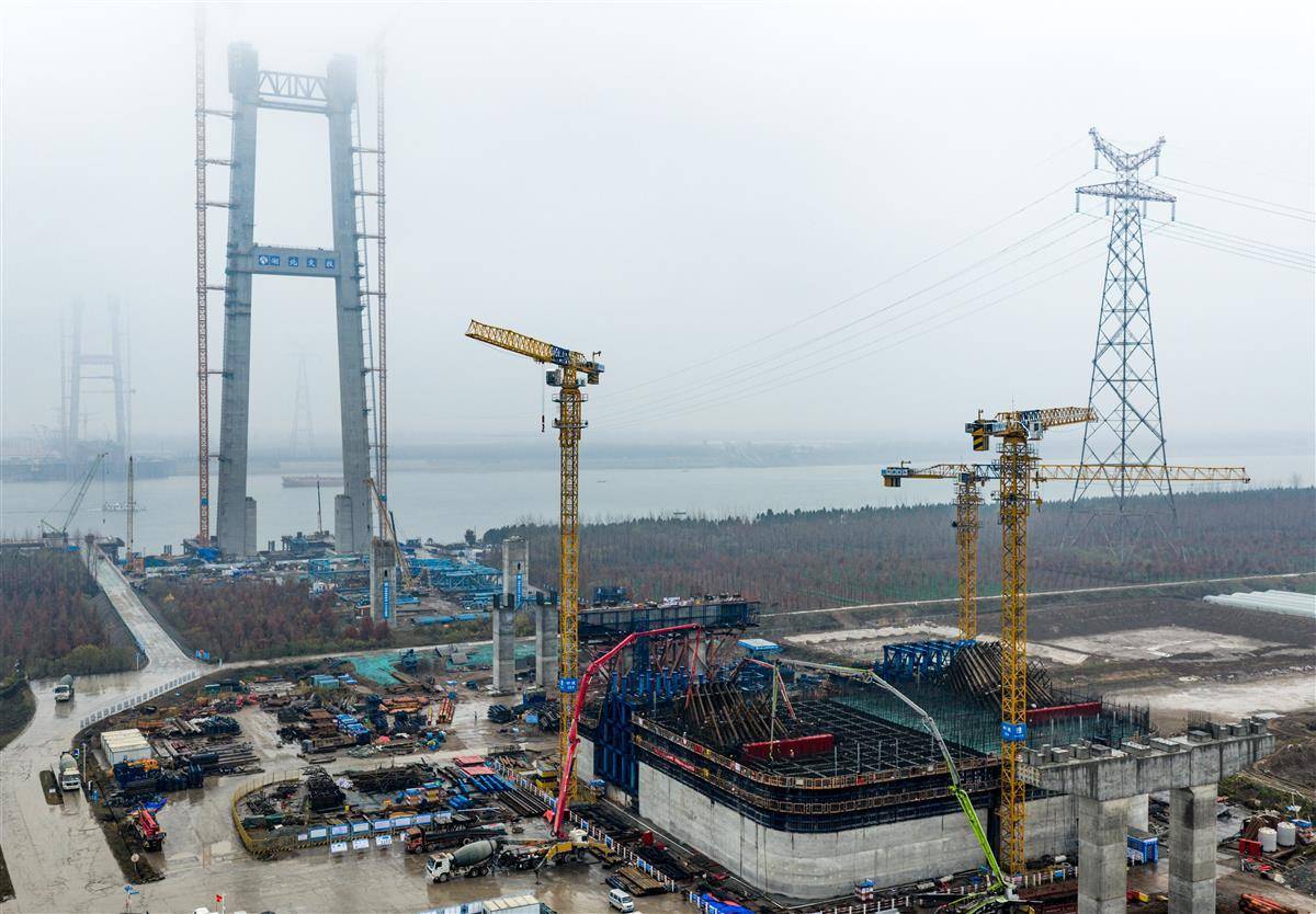 荆州礼部长江公铁大桥项目施工现场正忙碌。他们正在2026年春节前向通向主塔的方向冲刺。