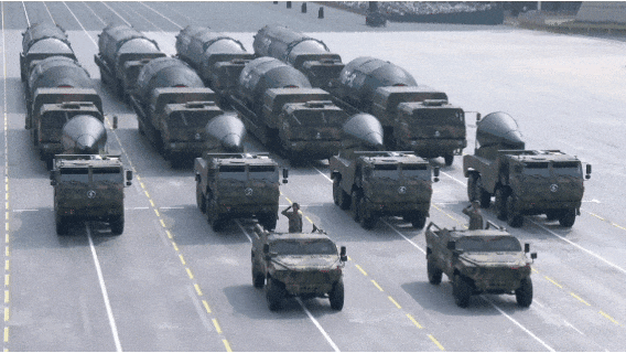 由12辆搭载4枚东风5C液体洲际战略核导弹的试验装备车组成的第二代核导弹最终亮相。东风强劲,雷霆万钧,尽显大国威武的威严。